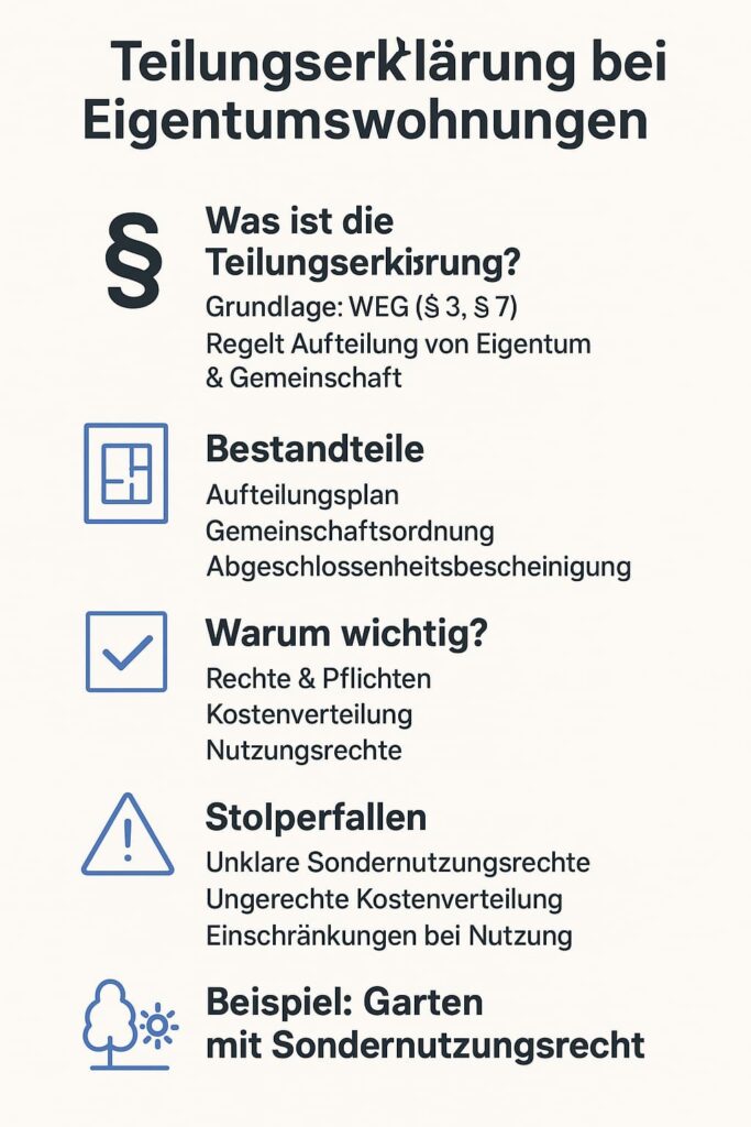 👉 Wer eine Eigentumswohnung kauft, sollte die Teilungserklärung vor Vertragsabschluss gründlich prüfen.